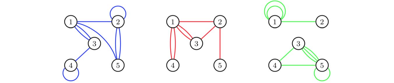 If we aggregate over time periods, we obtain for each edge category a multigraph for the total time period of three days: