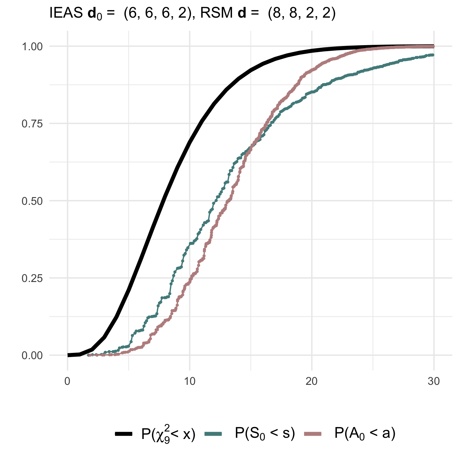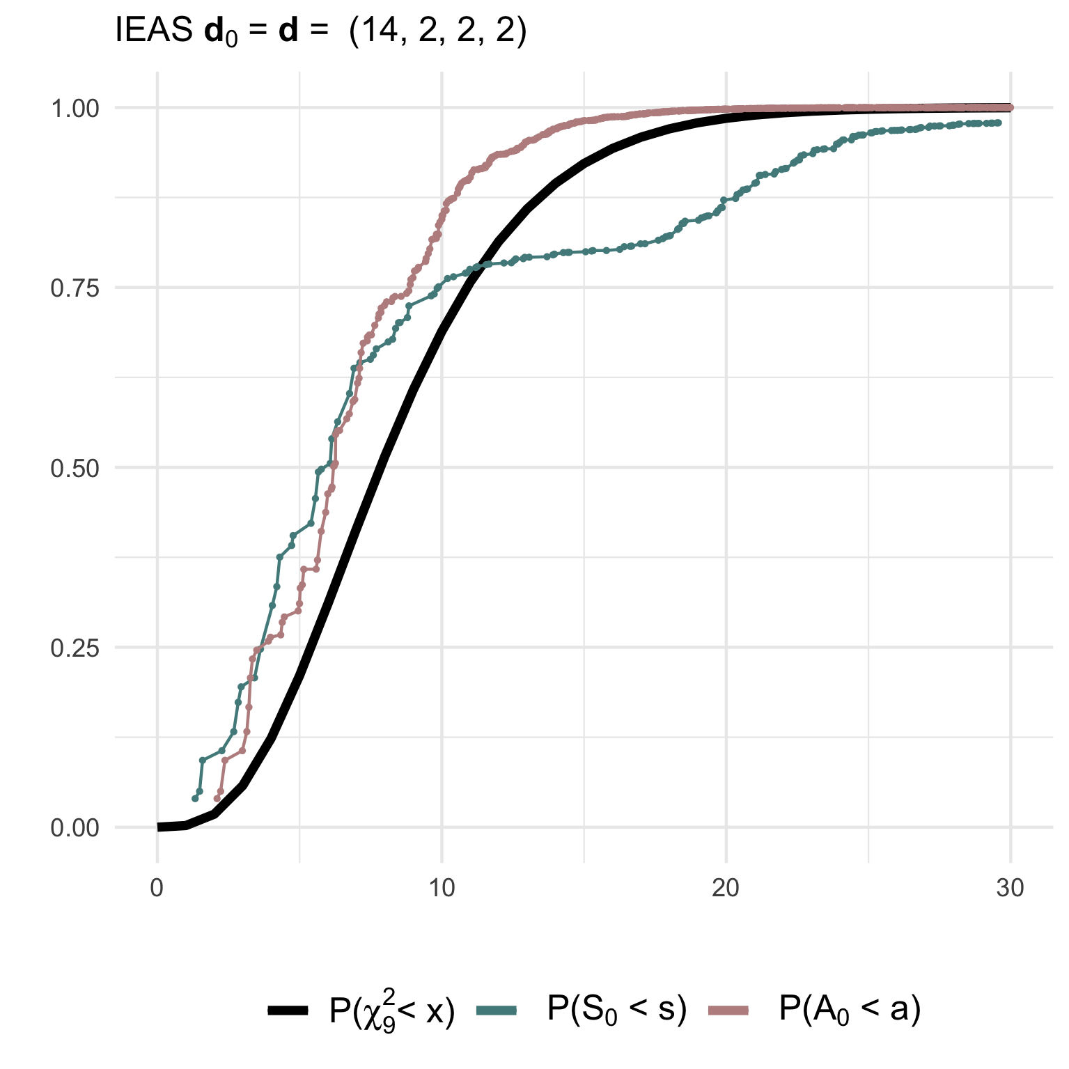 #> [1] 1 0 9 4 3 3 7 13Now we test whether the observed network fits the IEAS or the ISA model. The \(p\)-values for testing whether there is a significant difference between observed and expected edge multiplicity values according to the two approximate IEA models are given in the output tables below. Note that the asymptotic χ²-distribution has \(r-1 = (n(n+1)/2) - 1 =35\) degrees of freedom.
