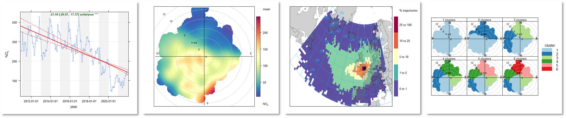 openair is an R package developed for the purpose of analysing air quality data — or more generally atmospheric composition data. The package is extensively used in academia, the public and private sectors. The project was initially funded by the UK Natural Environment Research Council (NERC), with additional funds from the UK Department for Environment Food & Rural Affairs (Defra).