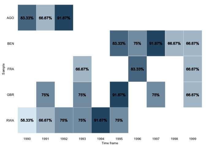 | Allows to quickly report time-series cross-sectional data coverage (figure/table) | ✓ | ||||||||