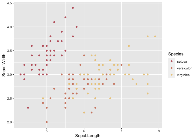 ggplot(iris, aes(Sepal.Length, Sepal.Width, color = Species)) +