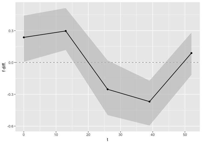 Finally, we can perform tests on the nonlinear functions. The first element of the list is an overall test of equality. If the p-value is \(< 0.05\), we reject the null hypothesis of equality and conclude that overall the two nonlinear functions are different. To obtain a comparison at each time point, confidence bands are computed, and a figure displaying these confidence bands is generated. For the time points associated with confidence bands that include \(0\), we cannot reject the null hypothesis that the nonlinear functions are the same for this time point. The data frame that is used to generate this figure can be found in the second element of the output list.
