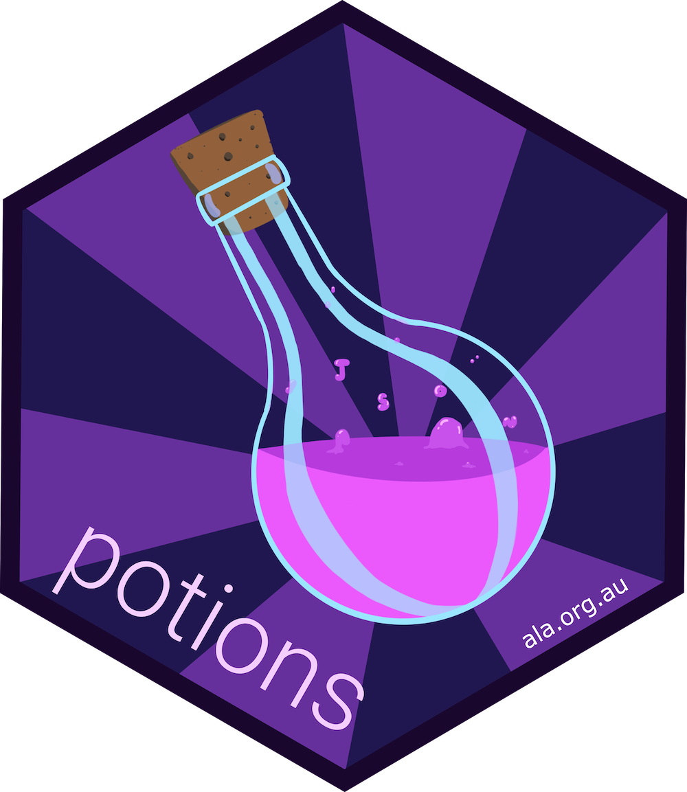 remotes::install_github("atlasoflivingaustralia/potions")To store data in options(), use brew()