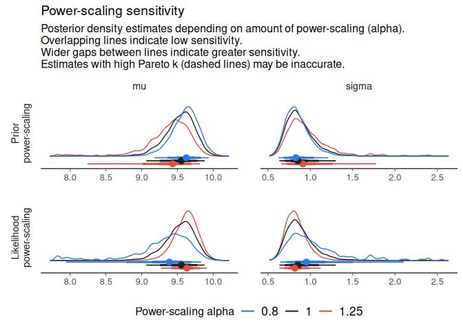 Power-scaling sensitivity analysis and priorsense are described in Kallioinen et al. (2023).