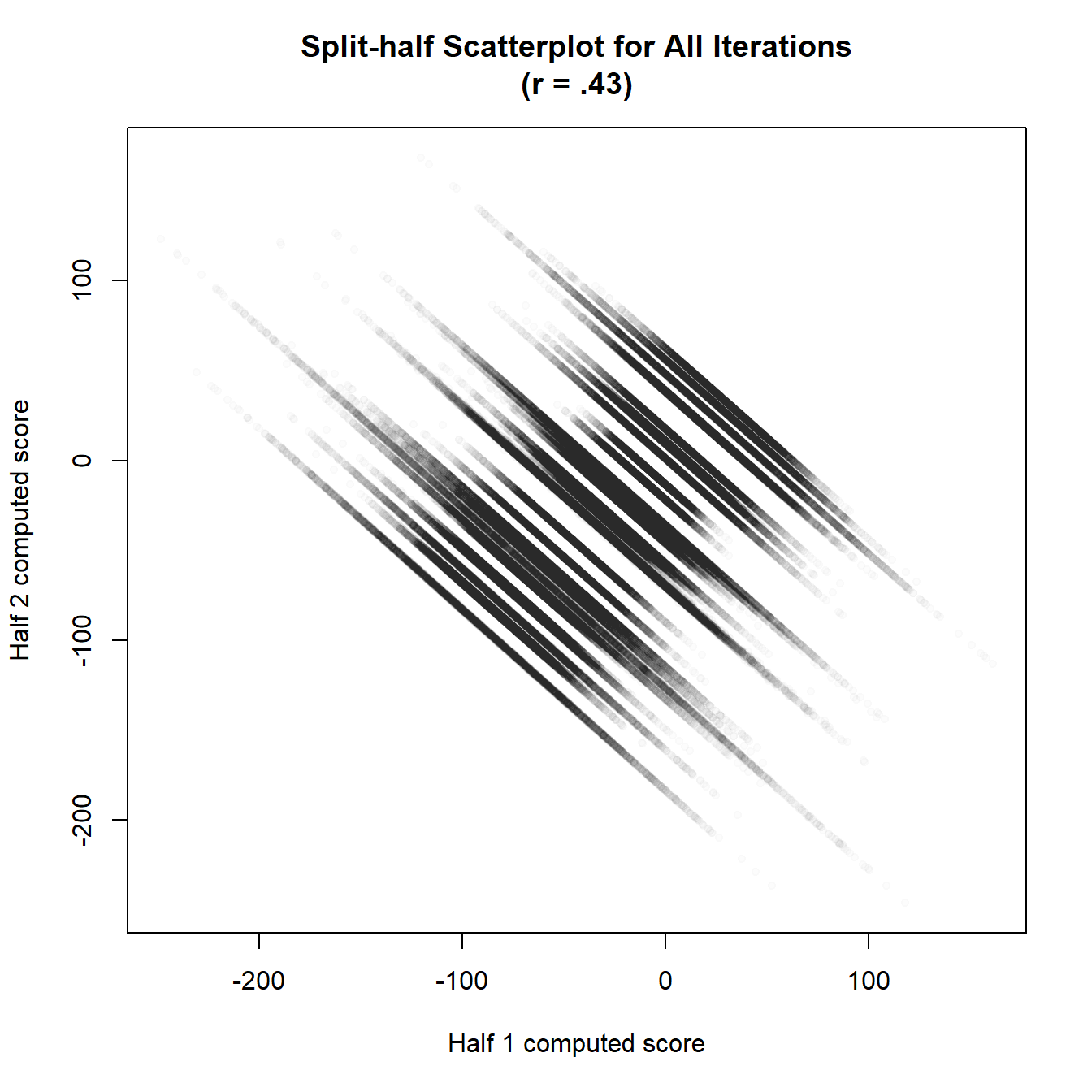 As discussed, if you’re using medians to aggregate your conditions, then the reliability of a medin-based score should be computed. We do so here within the context of a double-difference score, common to the approach-avoidance task. This has the following format: (push target - pull target) - (push control - pull control)