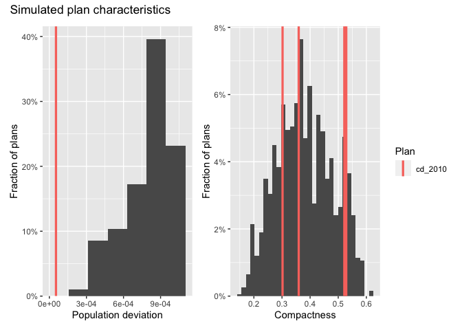 After generating plans, you can use redist’s plotting functions to study the geographic and partisan characteristics of the simulated ensemble.