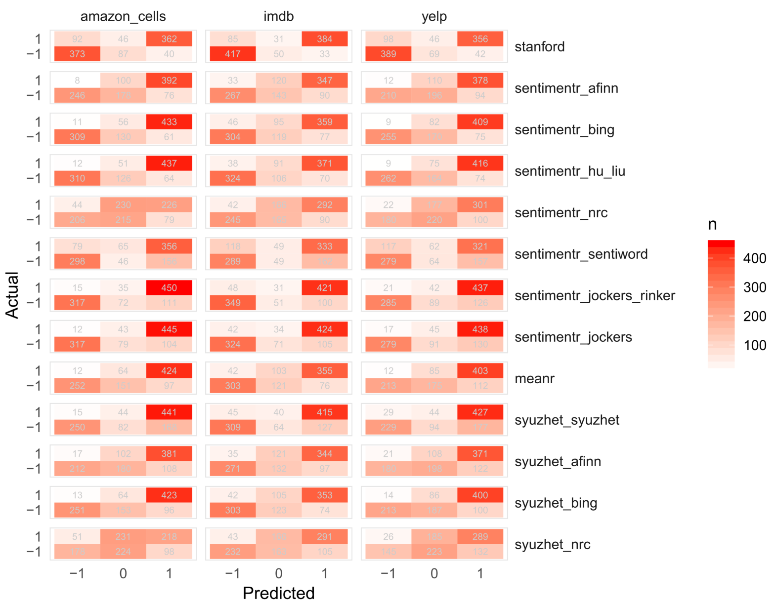 The take away here seems that, unsurprisingly, Stanford’s algorithm consistently outscores sentimentr, syuzhet, and meanr. The sentimentr approach loaded with the Jockers’ custom syuzhet dictionary is a top pick for speed and accuracy. In addition to Jockers’ custom dictionary the bing dictionary also performs well within both the syuzhet and sentimentr algorithms. Generally, the sentimentr algorithm out performs syuzhet when their dictionaries are comparable.