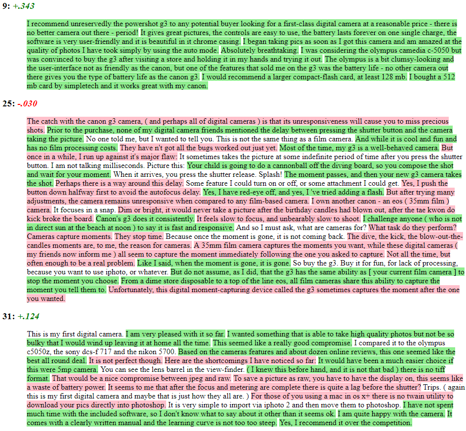 The user may wish to see the output from sentiment_by line by line with positive/negative sentences highlighted. The highlight function wraps a sentiment_by output to produces a highlighted HTML file (positive = green; negative = pink). Here we look at three random reviews from Hu and Liu’s (2004) Cannon G3 Camera Amazon product reviews.