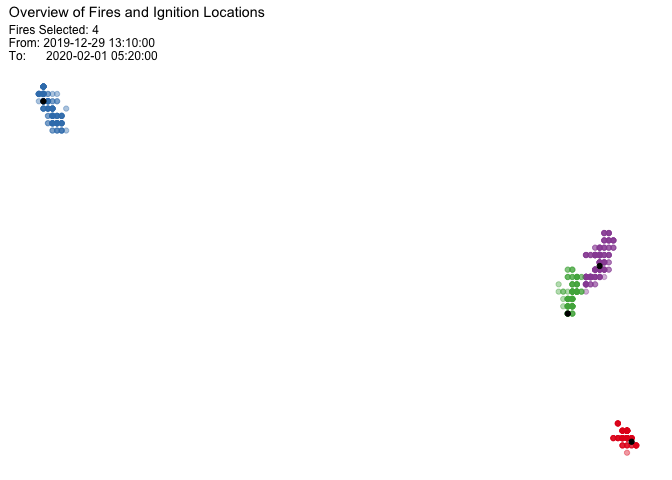 You can also choose a subset of clusters, and this will plot without a map, so that you can see a zoomed in view of the hot spot clusters and their ignition points.