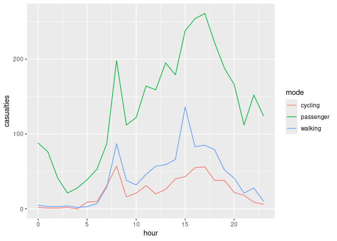 The next step is to gain a deeper understanding of stats19 and the data it provides. Then it’s time to pose interesting research questions, some of which could provide an evidence-base in support policies that save lives. For more on these next steps, see the package’s introductory vignette.