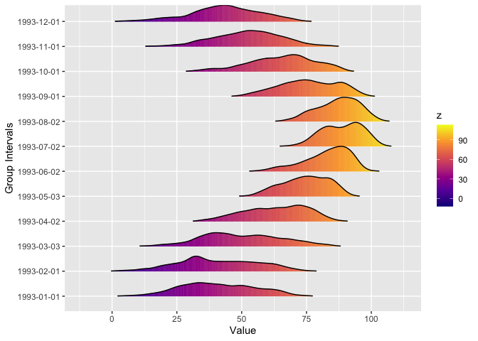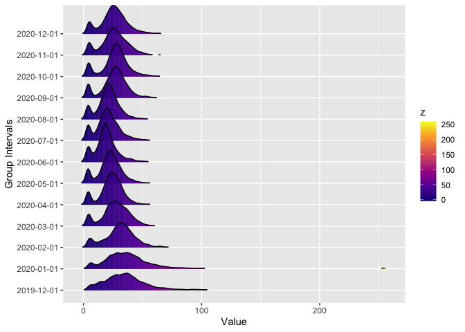 Of course if we group by longitude, there wouldn’t be much difference between the groups. What about the difference over time? Can we see that using Ridgeline plots?
