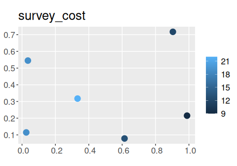 This has just been a taster of the surveyvoi R package. In addition to this functionality, it can be used to evaluate survey schemes using value of information analysis. Furthermore, it can be used to generate survey schemes using conventional approaches (e.g. sampling environmental gradients, and selecting places with highly uncertain information). For more information, see the package vignette.