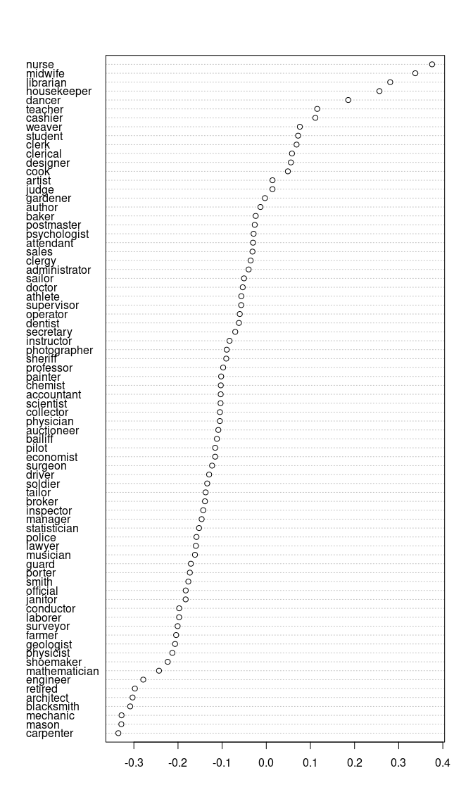 #>          cook     attendant       sheriff        dancer  photographer