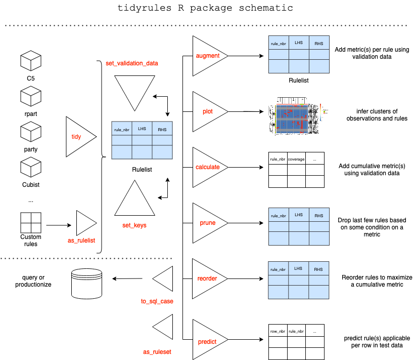 tidyrules R package provides a framework to work with decision rules. Rules can be extracted from supported models, augmented with (custom) metrics using validation data, manipulated using standard dataframe operations, reordered and pruned based on a metric, predict on unseen (test) data. Utilities include; Creating a rulelist manually, Exporting a rulelist as a SQL case statement and so on. The package offers two classes; rulelist and ruleset based on dataframe.