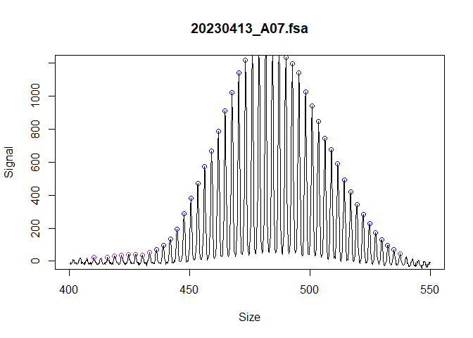 Alternatively, this is where you would use data exported from Genemapper if you would rather use the Genemapper bp sizing and peak identification algorithms. However, this is not recommended as some of the functionality of this package would not be accessible (mainly in call_repeats(), with batch_correction and repeat calling algorithms)