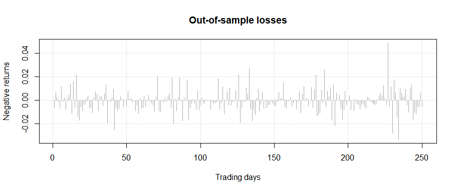 Plotting the out-of-sample loss series, VaR.v & breaches: