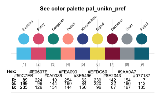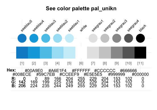 A shorter version (with 10 colors) and an alternative (with more muted colors for PowerPoint presentations) are provided as pal_unikn_web and pal_unikn_ppt, respectively. (Inspect seecol("unikn_basic") or see the corporate design specifications for details.)