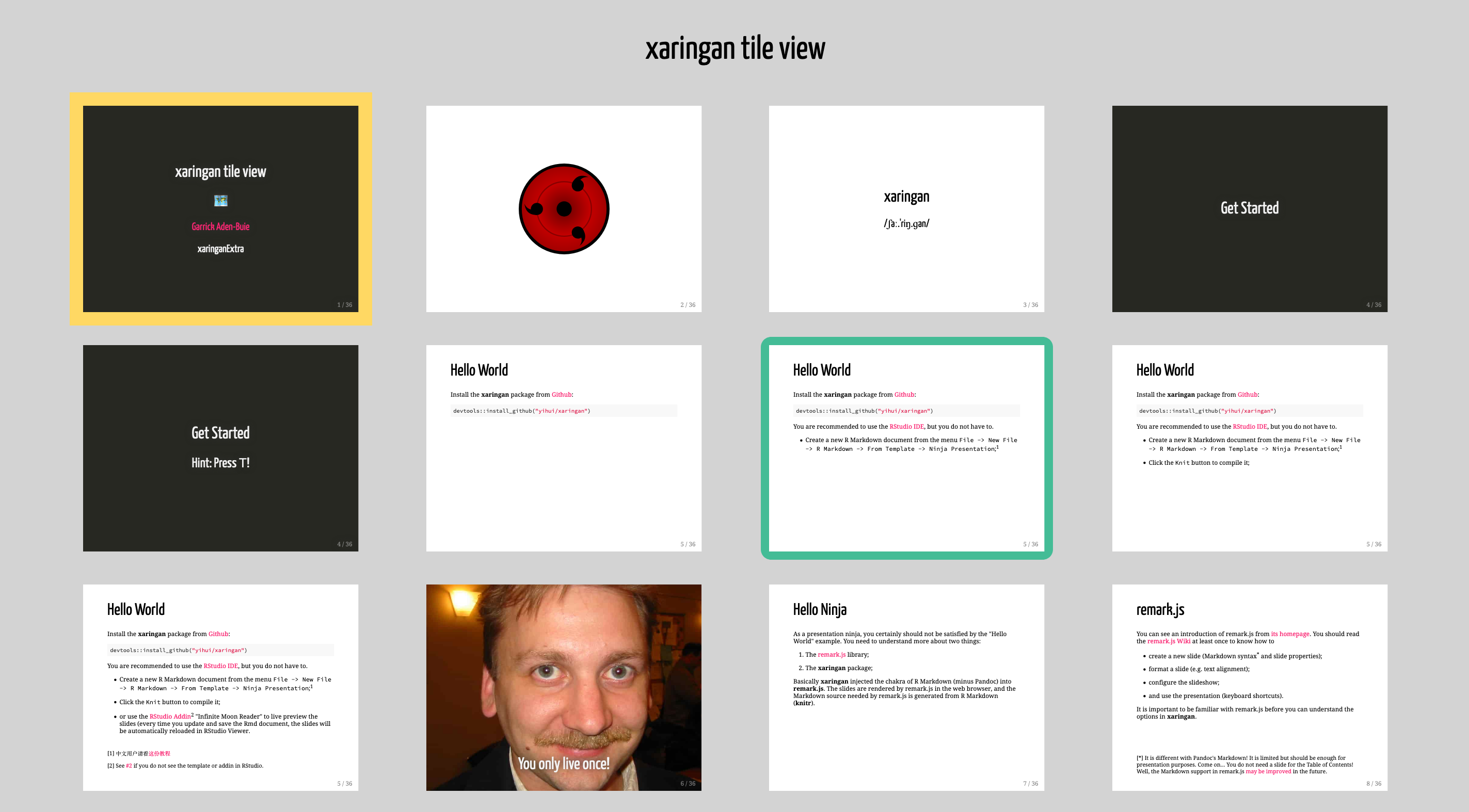 To add tile view to your xaringan presentation, add the following code chunk to your slides’ R Markdown file.