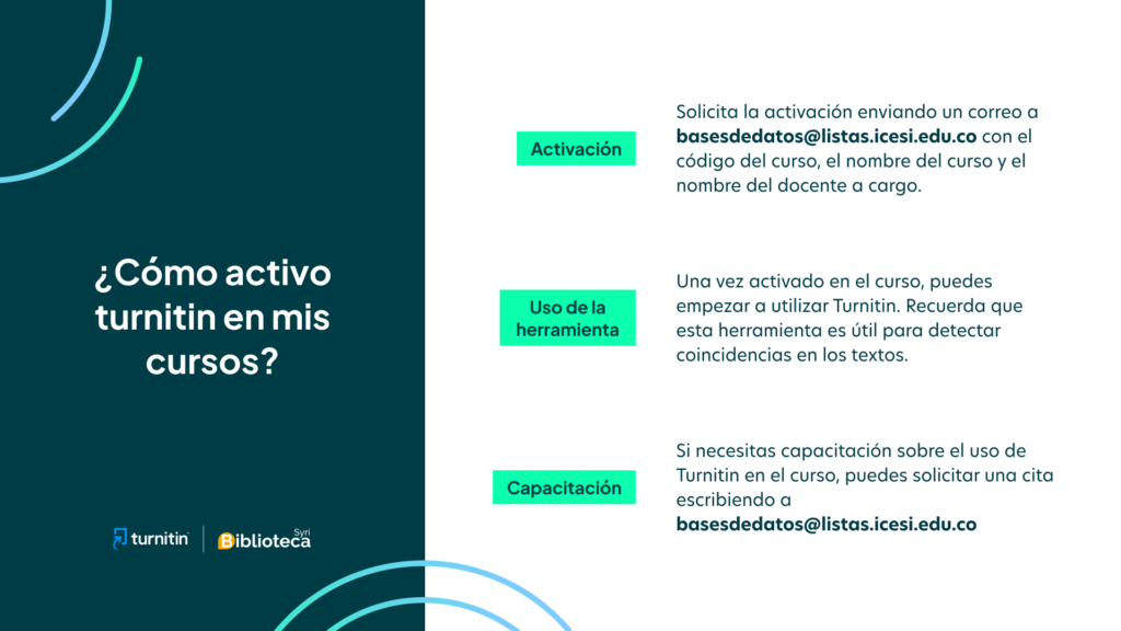 - Los estudiantes deberán solicitar a Biblioteca una capacitación sobre el uso del recurso Turnitin® en caso que no conozcan la herramienta.