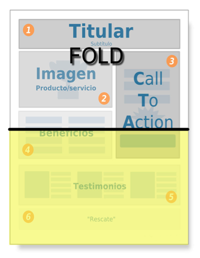 Al ver la línea amarilla que se súper puso en la estructura del landing page podemos concluir que las piezas claves son: