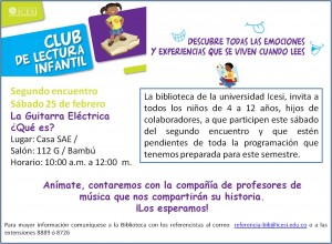 La biblioteca de la Universidad Icesi, invita a todos los niños de 4 a 12 años, hijos de estudiantes y colaboradores, a que participen este sábado del segundo encuentro y que estén pendientes de toda la programación que tenemos preparada para este semestre, en la que se incluyen fabulosas experiencias a partir de cuentos infantiles, música, obras de teatro y una salida al zoológico.