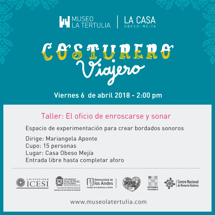 El oficio de enroscarse y sonar es un espacio de experimentación para crear bordados sonoros ¿cómo? Sí, sonoros. Integrando técnicas tradicionales de bordado como el punto de cruz y materiales alternativos como el cobre o el hilo conductivo, cada bordado tendrá la potencia de contener un patrón y de ser portador de sonidos, voces e incluso musicalidades. Durante el taller los participantes son invitados a diseñar una espiral sonora en la creación de un parlante de baja calidad usando fibras metálicas incrustadas en un textil junto a una expresión gráfica. En este espacio el mundo de la tradición artesanal y la experimentación electrónica se encontrarán en la encarnación de simples artesanías post-digitales.