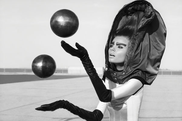 “El cabello de la mujer es liso y de color oscuro, está elevado completamente, recto hacia arriba. Su cabeza está rodeada por un gorro hecho de tela brillante impermeable, que se asemeja a un casco espacial pero sin cubierta frontal, y además se abotona sobre el cuello, este, deja ver su rostro y gran parte de su pelo. Su cara es de rasgos finos, esta levemente levantado. Sobre sus cejas está marcada una figura rectangular de color negro que es de un ancho mayor al de las cejas pero de igual longitud. Sus ojos están maquillados con sombras negras tanto en su parpado exterior como inferior, los cuales miran fijamente las esferas, su boca está entreabierta dejando ver sus dientes blancos y alineados”. Luis R.