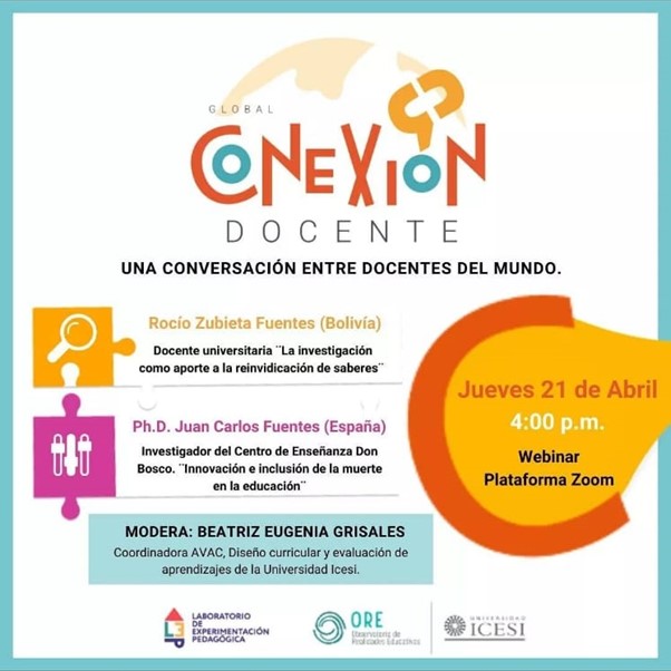 El Laboratorio de experimentación pedagógica y el Observatorio de realidades educativas de la Universidad Icesi realizaron, el 21 de abril de 2022 a través de la plataforma zoom, el primer encuentro Conexión docente global, un espacio de conversación entre docentes del mundo. En esta ocasión, los invitados fueron Rocío Zubieta Fuentes, docente universitaria de Bolivia, que conversó acerca de la investigación como aporte a la reivindicación de saberes, y Juan Carlos Fuentes, investigador del Centro de Enseñanza Don Bosco, de España, que habló acerca de la innovación e inclusión de la muerte en la educación.