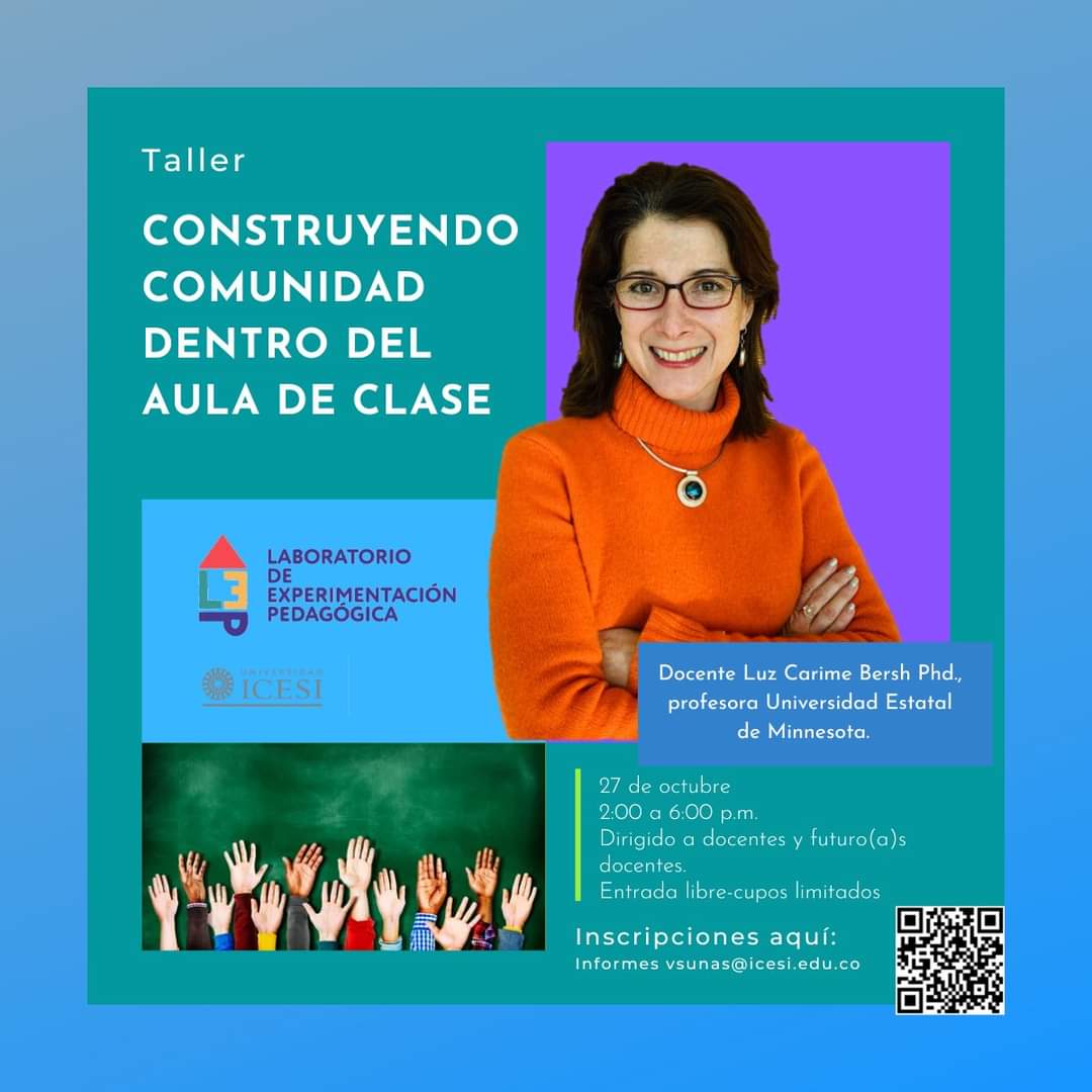 El Laboratorio de experimentación pedagógica invitó a los estudiantes de licenciaturas de la Universidad Icesi al Taller Construyendo comunidad dentro del aula de clase, dictado por Luz Karime Bersh, docente de la Universidad Estatal de Minnesota. El evento, dirigido a docentes y futuros docentes, se llevó a cabo el 27 de octubre a las 2 p.m. en el Laboratorio de Experimentación Pedagógica. La profesora Bersh trabajó con el grupo distintas alternativas para la interacción respetuosa, el fomento de la confianza y la construcción del salón de clases como un lugar seguro.