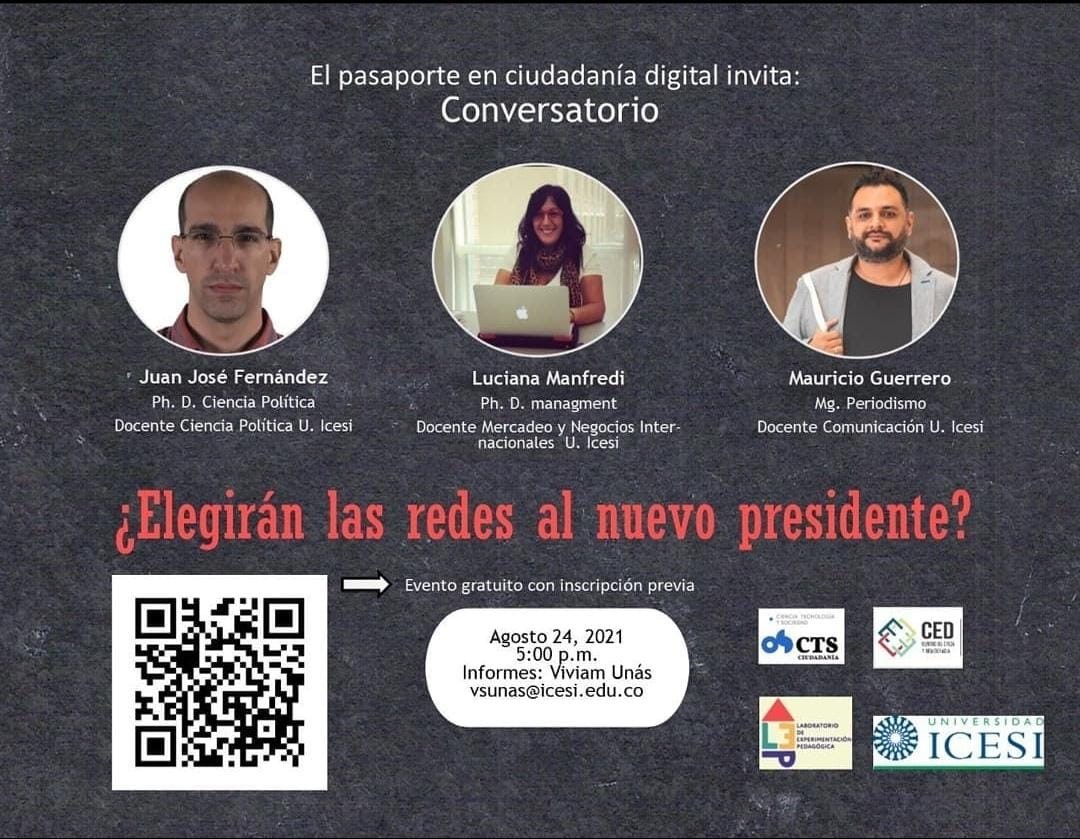 El pasaporte en Ciudadanía digital invitó a la comunidad icesista a participar del conversatorio ¿Elegirán las redes al nuevo presidente?, que se realizó de forma virtual el 24 de agosto de 2021. Al conversatorio estuvieron invitados tres profes de la Universidad Icesi: Juan José Fernández, docente de Ciencia Política; Luciana Manfredi, docente de Mercadeo y Negocios Internacionales; y Mauricio Guerrero, docente de Comunicación.