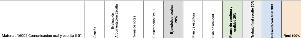 La distribución de notas en Banner incluye un componente llamado Oralidad, donde promedié varios trabajos de argumentación: la reseña, la evaluación de argumentación de INTU, la toma de notas de textos académicos y la presentación oral de un minuto. Este componente vale 20% de la nota final.