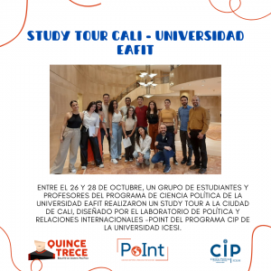 Los y las estudiantes del programa de Ciencia Política con Énfasis en Relaciones Internacionales, visitaron la Casa de Nariño y el Congreso de la República, adicionalmente acudieron a la Agencia de Cooperación Internacional USAID, los centros de pensamiento Konrad Adenauer y el Instituto de Ciencia Política, museos y sitios del interés histórico-político. Por último, pero no menos importante tuvieron la reunión con los y las egresados/as del CIP que trabajan en Bogotá. De acuerdo a uno de los participantes, “me gocé mucho el Study Tour y aprendí mucho más de lo esperado.” El año que viene, se organizará un nuevo Study Tour Nacional, esta vez, a la ciudad de Medellín.
