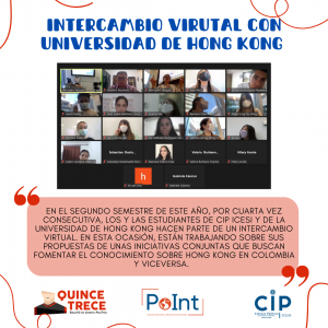 El profesor Vladimir Rouvinski en colaboración con la profesora Mercedes Vásquez de la Universidad de Hong Kong, han realizado nuevamente el “intercambio virtual” entre estudiantes de la Facultad de Derecho y Ciencias Sociales y de la carrera de economía de la Universidad Icesi con estudiantes de la Universidad de Hong Kong. El objetivo de este intercambio es trabajar en conjunto con proyectos, los cuales buscan acercar los territorios y fomentar iniciativas innovadoras.