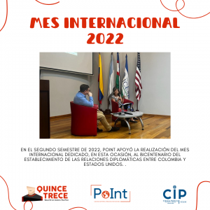 Entre las actividades realizadas se encuentran el conversatorio entre la Dra. Arlene Tickner (U. del Rosario, actual embajadora alterna de Colombia ante las Naciones Unidas) y el Dr. Vladimir Rouvinski (Director PoInt), sobre el pasado, presente y el futuro de las relaciones colombo-estadounidenses. De igual manera, los y las estudiantes de varios cursos del programa CIP aprovecharon de visita del Dr. Andrei Korobkov (U. Estatal del Tennessee Medio) quien habló con estudiantes sobre sus estudios de la migración internacional y las imágenes de las otras nacionalidades en Estados Unidos construidas por medio del cine.