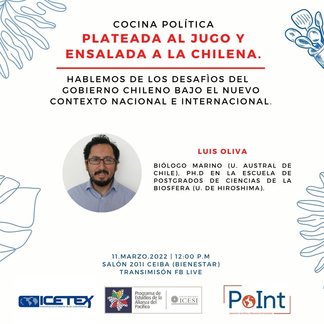 El Laboratorio de Política y Relaciones Internacionales PoInt de la Universidad Icesi junto con el Programa de Estudios de la Alianza del Pacífico -PEAP- de la Universidad Icesi, realizaron la segunda cocina política del semestre acerca de Chile. En esta oportunidad nos acompañó el profesor Luis Oliva, quien nos habló de los desafíos del gobierno chileno bajo el nuevo contexto nacional e internacional, mientras preparaba Plateada al jugo y ensalada a la chilena.