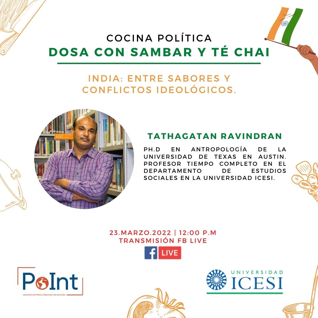 El Laboratorio de Política y Relaciones Internacionales -PoInt- de la Universidad Icesi realizó la tercera cocina política del semestre acerca de la India. En esta oportunidad nos acompañó el profesor Tathagatan Ravindran, quien preparó Dosa con Sambar y té chai, mientras nos habló de la relación entre gastronomía y conflictos ideológicos en India.