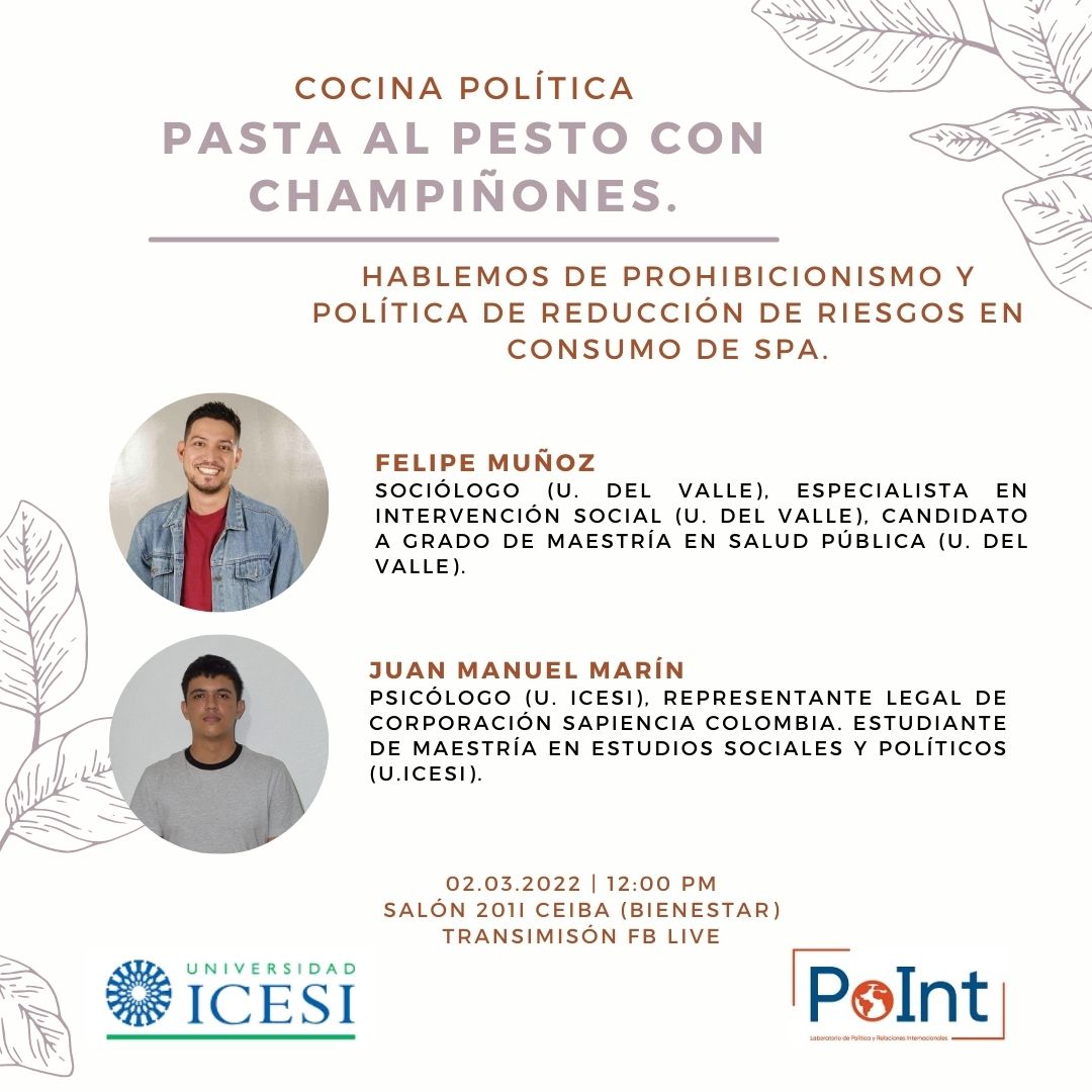 El Laboratorio de Política y Relaciones Internacionales -PoInt- de la Universidad Icesi, realizó la primera cocina política del semestre. En esta oportunidad nos acompañaron Juan Manuel Marín Y Felipe Muñoz, quienes cocinaron pasta al persto con champiñones mientras hablaron acerca del prohibicionismo y la Política de Reducción de Riesgos en consumo de SPA.