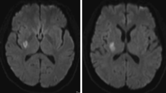 En esta secuencia de difusión de una resonancia magnética se aprecia una lesión isquémica (área blanca) en la cápsula interna derecha, en la parte más posterior del brazo posterior. Por esta razón el paciente no tiene comprometida la cara.
