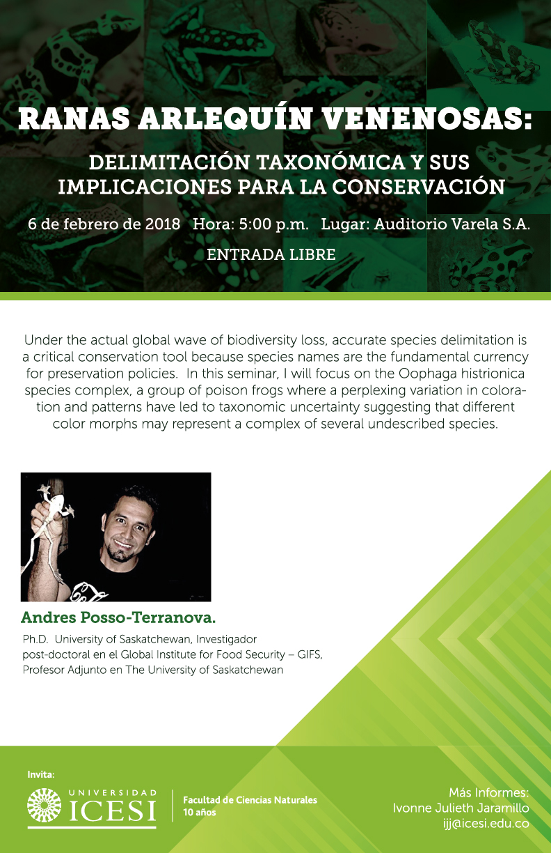 HomeINVITACIÓN A LA CONFERENCIA: RANAS ARLEQUÍN VENENOSAS: DELIMITACIÓN TAXONÓMICA Y SUS IMPLICACIONES PARA LA CONSERVACIÓN INVITACIÓN A LA CONFERENCIA: RANAS ARLEQUÍN VENENOSAS: DELIMITACIÓN TAXONÓMICA Y SUS IMPLICACIONES PARA LA CONSERVACIÓNBy Ivonne Julieth Jaramillo Gonzalez / febrero 1, 2018