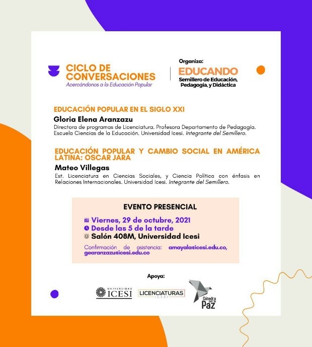 El Semillero Educando, coordinado por la docente de la Escuela Ana María Ayala, dio inicio a sus actividades durante el semestre 2021-2. Durante este periodo sus integrantes delimitaron un tema de investigación: prácticas pedagógicas de educación popular en el contexto del Paro Nacional de 2021. Además establecieron un objetivo: analizar y sistematizar algunas propuestas educativas populares. Para lograrlo, comenzaron definiendo el concepto de educación popular, extendiendo una invitación a la comunidad icesista para conversar acerca del significado que este ha tenido según distintos autores.