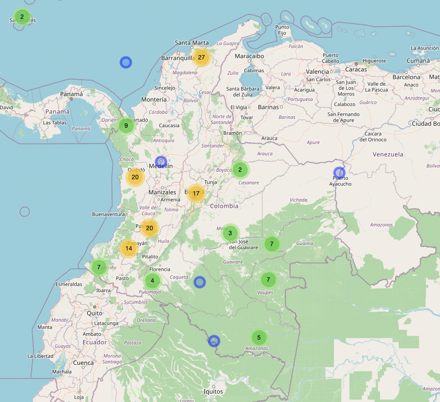 Finalmente, tratando de emular el mapa de geoparques que ha producido el ICANH el año pasado para la investigación arqueológica, comenzamos a trabajar con un google maps para localizar geográficamente las etnografía más destacadas de cada periodo. Después de cargar diferentes informaciones, el mapa terminó siendo una confusión de puntos superpuestos difíciles de navegar. Por ello comenzamos a explorar los mapas interactivos que permite producir la aplicación RStudio y trabajamos a partir de clusters que se van desplegando a medida que se aumenta el zoom. Esto nos permitió depurar la información consignada en el mapa inicial colectivo y empezar a trabajar en una base de datos que pudiera ser cargada a R como se ve en el mapa a continuación: