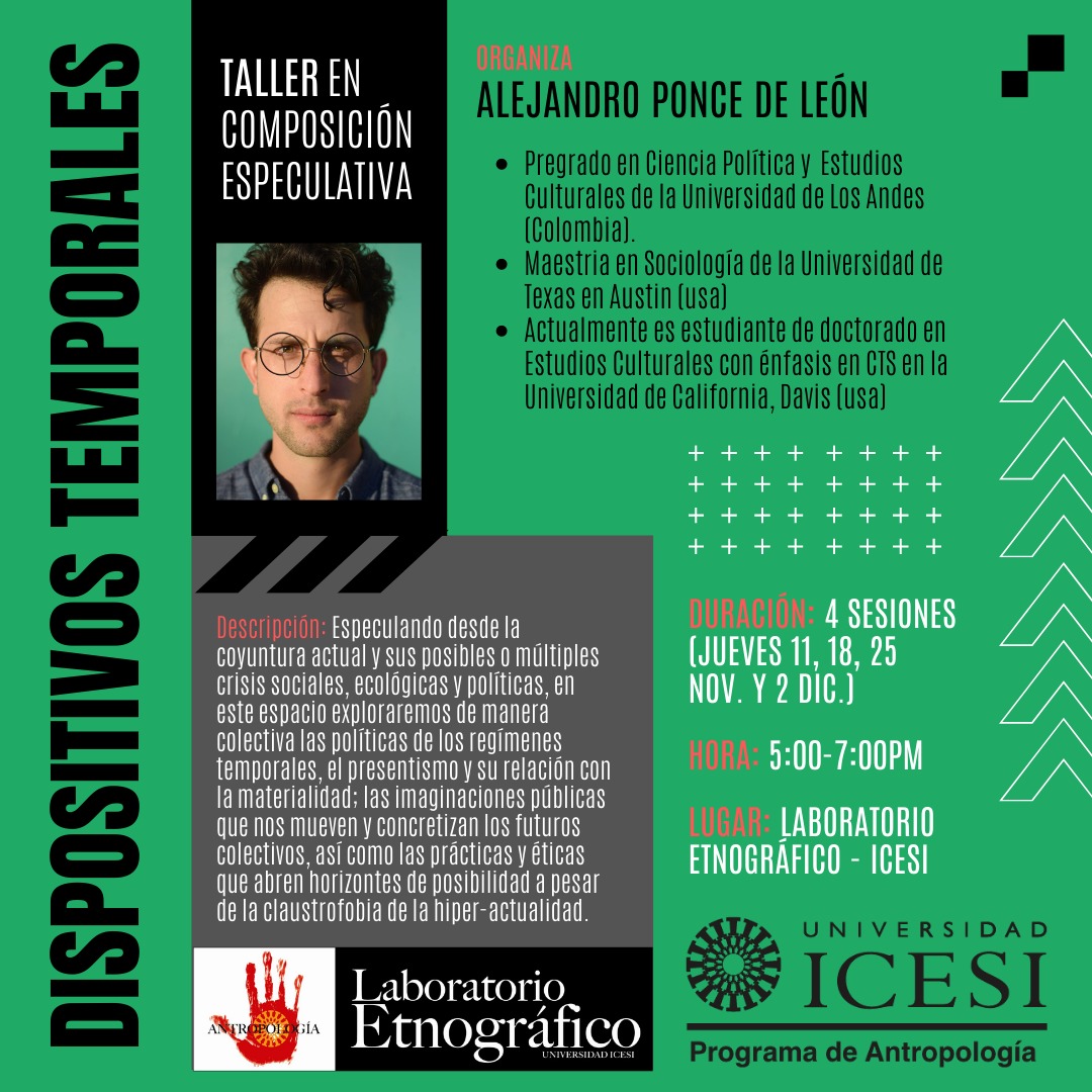En noviembre Alejandro Ponce de León ofrecerá un taller de 4 sesiones sobre dispositivos temporales en el Laboratorio Etnográfico. Solo disponemos de 10 cupos, así que estén pendientes del correo para postularse.