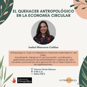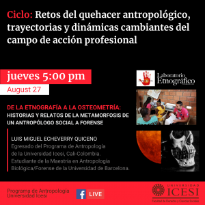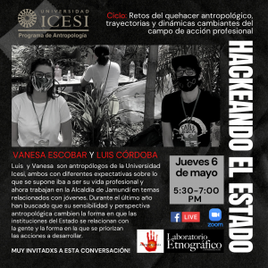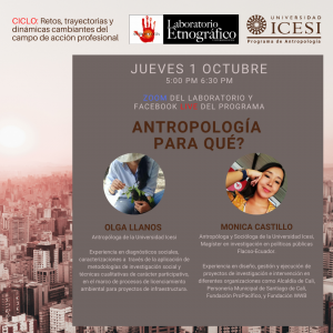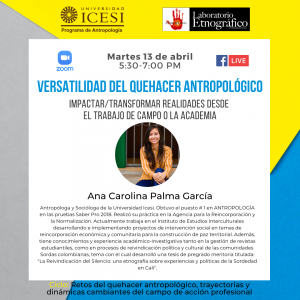 Este ciclo de convesatorios se propone desarrollar miradas biográficas de las trayectorias profesionales, prácticas y oficios de los egresados del Programa de Antropología de la Universidad Icesi. El interés es sondear las posibilidades y retos abiertos por la ampliación y diversificación del ejercicio profesional, así como reflexionar sobre transformaciones generacionales, la precariedad del trabajo, o la fragilidad de la relación contractual. También son de interés las zonas de contacto y las tensiones entre antropólogos que trabajan en las instituciones académicas y no académicas, o reflexiones sobre el tipo de conocimiento e intervenciones que se están produciendo dentro y fuera de la disciplina, y consideraciones sobre los usos y límites de los métodos y las categorías analíticas.