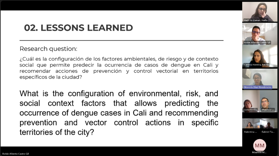 Uno de los logros clave fue la definición de la pregunta central que orientará el desarrollo del modelo: ¿Cuál es la configuración de los factores ambientales, de riesgo y de contexto social que permite predecir la ocurrencia de casos de dengue en Cali y recomendar acciones de prevención y control vectorial en territorios específicos de la ciudad? Esta formulación permitirá alinear los esfuerzos técnicos, sociales e institucionales en torno a una misma ruta de investigación y acción.