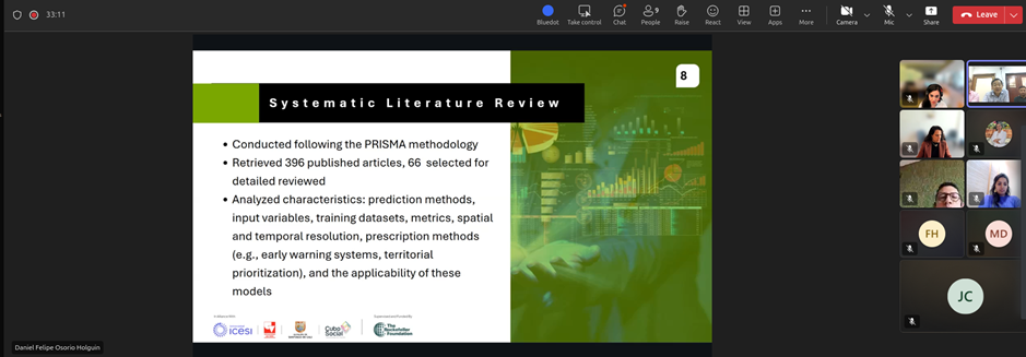 Además, se priorizó la incorporación y automatización de datos meteorológicos y ambientales como insumos críticos del modelo. La discusión técnica se complementó con una reflexión colectiva liderada por Cubo Social, en la que se identificaron aprendizajes clave del proceso, entre ellos la construcción de confianza entre actores, la claridad en roles y responsabilidades, y la efectividad de los espacios de trabajo presenciales.