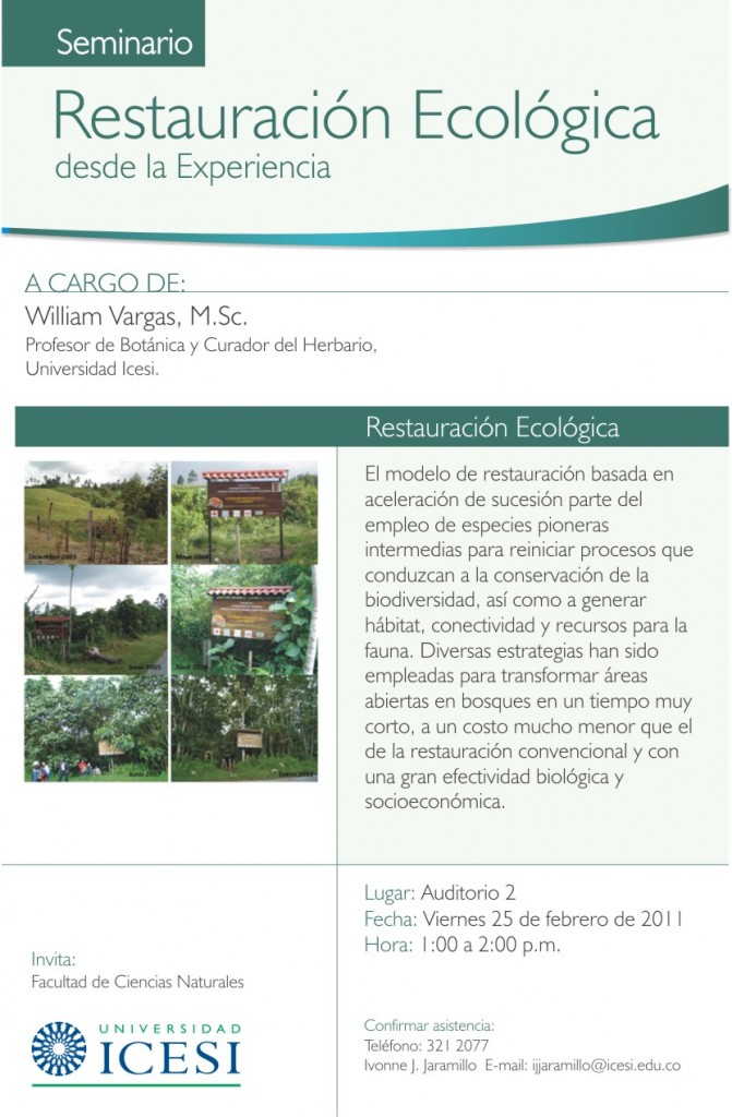 La Facultad de Ciencias Naturales los invita el próximo 25 de febrero al Seminario Restauración Ecólogica, desde la Experiencia. A cargo de  William Vargas, M.Sc., Profesor de Botánica y Curador del Herbario, Universidad Icesi.