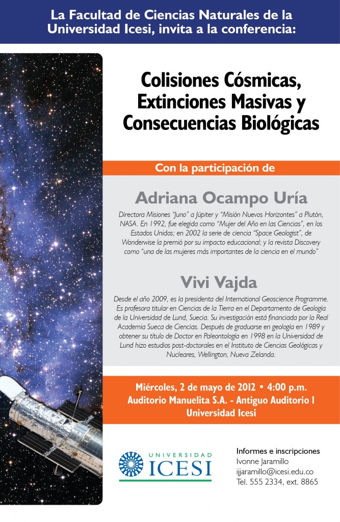 La Facultad de Ciencias Naturales de la Universidad Icesi les invita A LAS CONFERENCIAS: Colisiones Cósmicas, Extinciones Masivas y Consecuencias Biológicas, presentadas por la Dra. Adriana Ocampo Uría (NASA) y la Dra. Vivi Vadja (Universidad Lund, Suecia). La Dra. Ocampo participó en el grupo de investigación que encontró las primeras evidencias que confirmaron que el impacto de un asteroide o cometa en la península de Yucatán hace 65 millones de años causó la extinción masiva de mas del 70% de las especies vivientes en el plantea, incluyendo a los dinosaurios. Su presentación nos dará un recorrido interactivo ilustrando la formación de nuestra galaxia y sistema solar, las transformaciones físico-químicas del planeta Tierra para permitir la existencia de vida, y la investigación que concluye con el hallazgo del cráter Chicxulub formado por esta colisión. La Dra. Vivi Vajda es paleontóloga, experta en el uso de granos de polen como herramienta para reconstruir el inventario de especies de plantas extintas alrededor del planeta. En su charla nos ilustrará sus hallazgos de investigaciones realizadas particularmente en Nueva Zelanda.