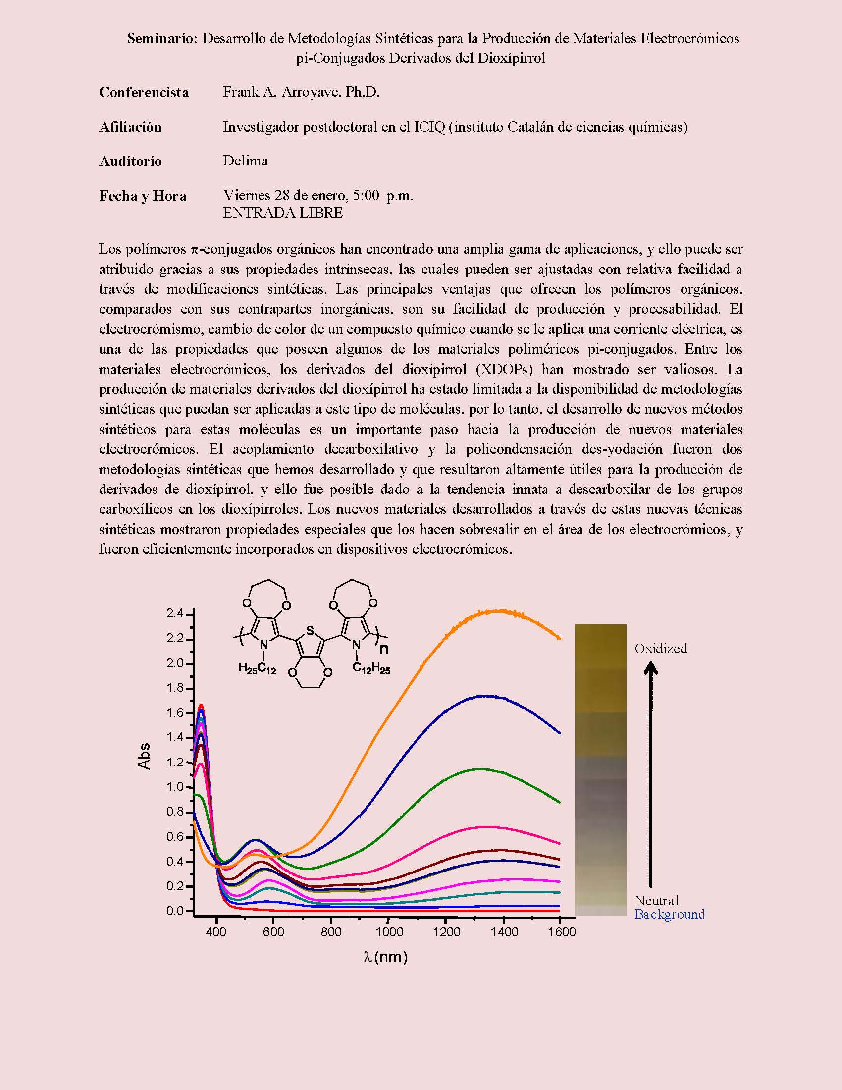 Seminario: Desarrollo de Metodologías Sintéticas para la Producción de Materiales Electrocrómicos pi-Conjugados Derivados del DioxípirrolBy Ivonne Julieth Jaramillo Gonzalez / 1 febrero 2013 http://ww2.chemistry.gatech.edu/reynolds/