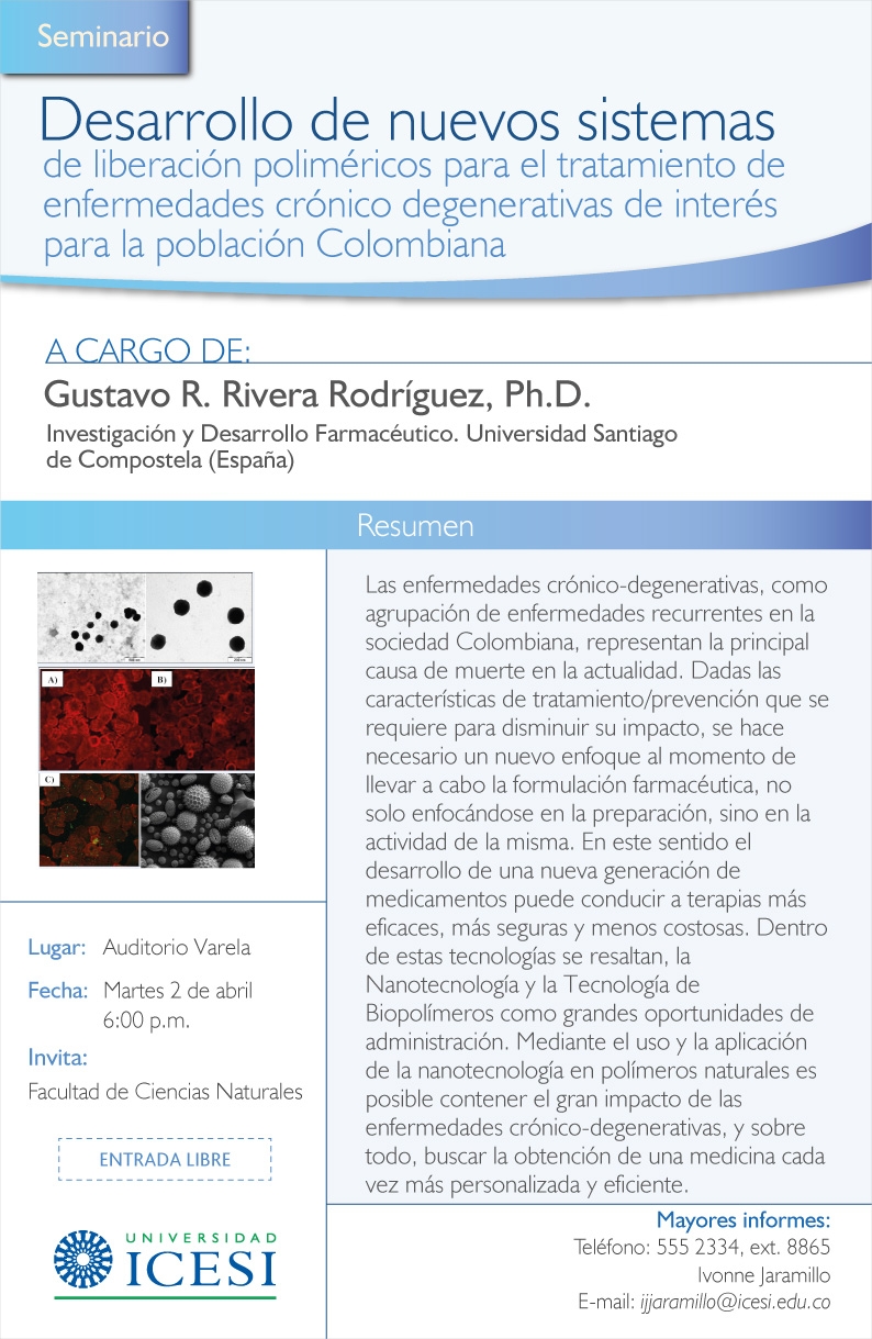 Seminario:Desarrollo de nuevos sistemas de liberación poliméricos para el tratamiento de enfermedades crónico degenerativas de interés para la población ColombianaBy Ivonne Julieth Jaramillo Gonzalez / 22 marzo 2013