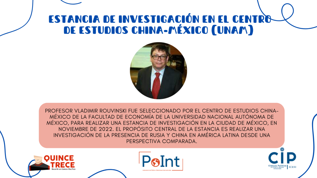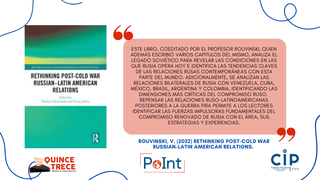 - Rouvinski, V. (2022) Rethinking Post-Cold War Russian–Latin American Relations. Pueden leer una parte del libro gratis en Amazon: https://www.amazon.com/-/es/Vladimir-Rouvinski/dp/103202125X (la función “Look Inside” está habilitada).